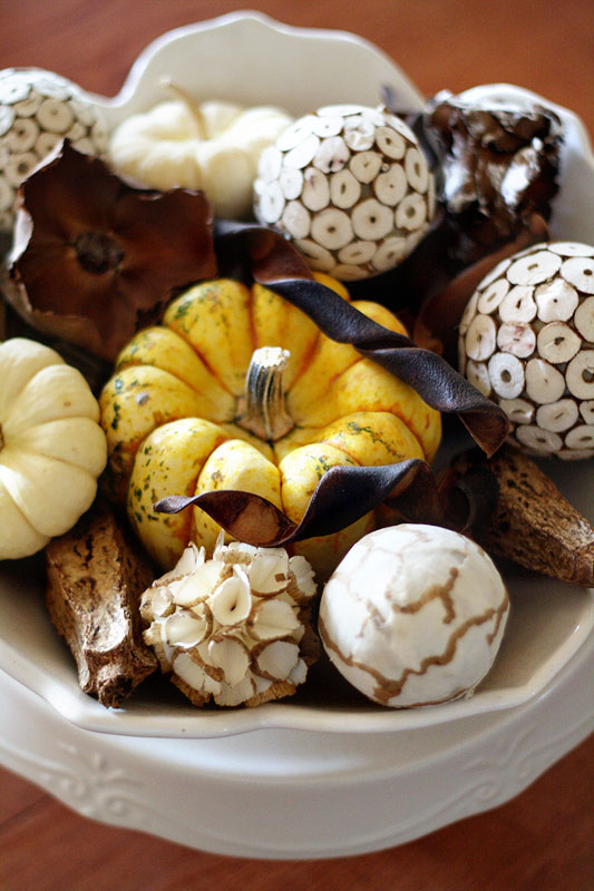 It's nothing flashy, just some pumpkins and gourds in a couple of places around the casa. I've never been big on the faux leaves/red/orange stuff, and I've actually never decorated for fall inside our house, so this is a big deal for me. ;)